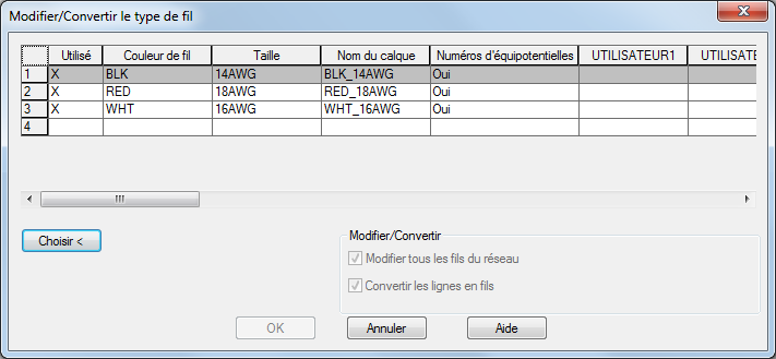 Les calques de fils existants sont répertoriés dans la grille. Modifiez la couleur et la taille en entrant des valeurs dans la grille. Pour renommer un calque, cliquez avec le bouton droit de la souris sur son nom et choisissez Renommer le calque.