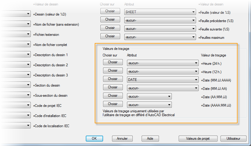 Dans la configuration du cartouche, vous pouvez associer un format de date et d'heure de tracé à un attribut spécifique. Cet attribut est automatiquement mis à jour lors du tracé du dessin.