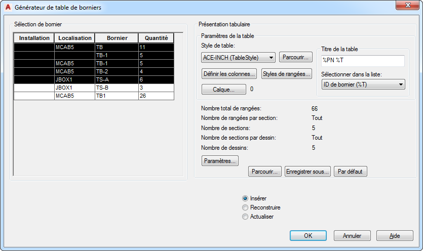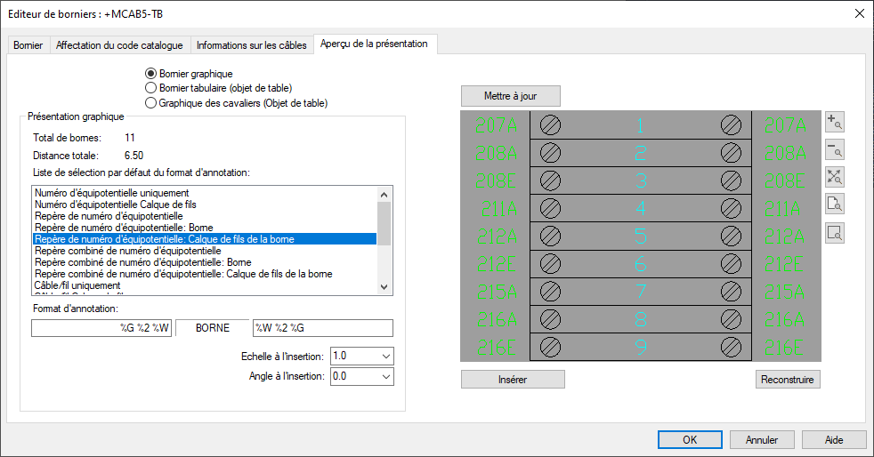 Si vous souhaitez insérer des borniers sous forme de tableau pour une ou plusieurs bornes, vous pouvez également utiliser le Générateur de tables de bornier. Trouver