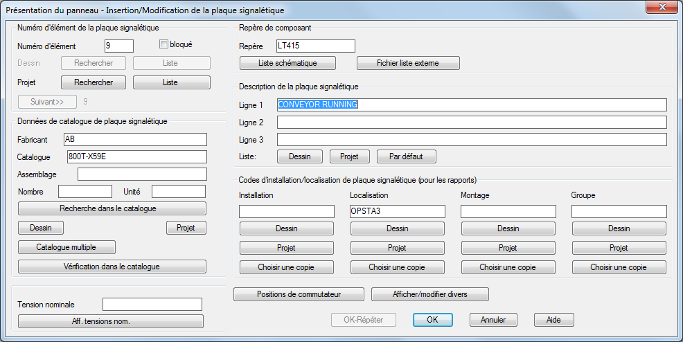 Lors de l'insertion d'une plaque signalétique, vous pouvez l'associer à un encombrement de panneau. Les valeurs associées à l'encombrement (notamment repère, installation, localisation et descriptions) sont copiées à partir de cet élément. Toutefois, vous pouvez affecter un numéro d'élément et une valeur de catalogue spécifiques à la plaque signalétique.