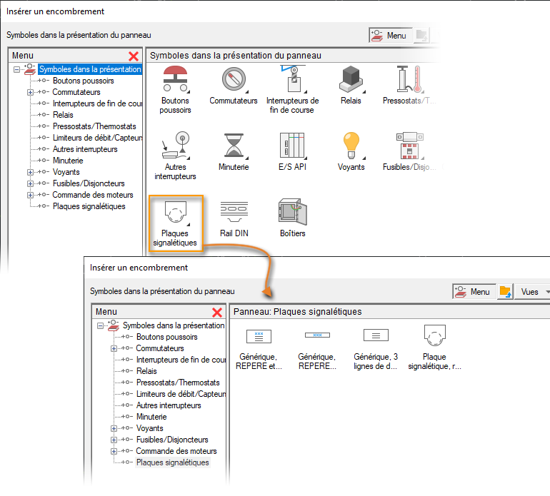 Pour les composants de panneau qui n'apparaissent pas dans le schéma, utilisez le menu d'icônes de panneau pour insérer des encombrements de panneau. Trouver