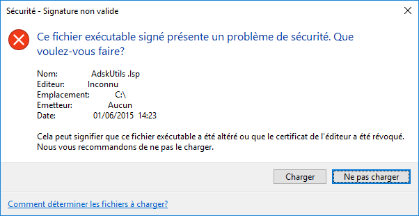 Lorsque vous chargez un fichier programme signé numériquement, le programme basé sur AutoCAD ou AutoCAD LT en vérifie la signature numérique. Selon que la signature numérique a pu être vérifiée ou non, un message autorisant ou refusant le chargement du fichier dans l'environnement de dessin apparaît.
