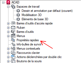 - Dans le volet Personnalisations dans <nom de fichier> de l'onglet Personnaliser, cliquez avec le bouton droit de la souris sur Propriétés rapides.
