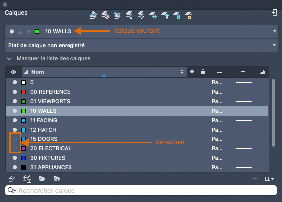 Pour créer un calque, cliquez sur le bouton affiché, puis entrez le nom du nouveau calque. Pour modifier le calque courant, double-cliquez sur son nom ou cliquez avec le bouton droit de la souris sur le nom du calque et choisissez Rendre actif.
