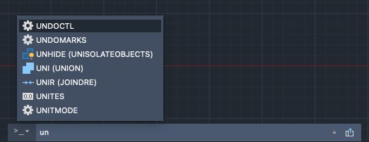 Lorsque vous commencez à saisir une commande, elle est complétée automatiquement. Lorsqu'il existe plusieurs possibilités, comme dans l'exemple ci-dessous, vous pouvez effectuer votre choix en cliquant dessus ou à l'aide des touches fléchées, puis appuyer sur la touche Entrée ou sur la barre d'espace.