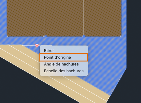 Si vous devez aligner le motif d'une hachure, ce qui peut être le cas avec les planches de terrasse en bois ci-dessus, placez le curseur sur la poignée d'origine de la hachure, puis sélectionnez l'option Point d'origine pour spécifier un point d'alignement.