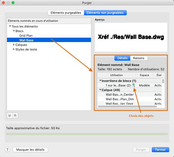 La boîte de dialogue PURGER affiche les objets qui ne peuvent pas être purgés. Vous pouvez basculer entre l'affichage de la liste des éléments purgeables et des éléments non purgeables.