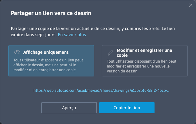 Permet de partager un lien vers une copie du dessin en cours pour l'afficher ou la modifier dans l'application Web AutoCAD. Toutes les images et références externes DWG associées sont incluses.