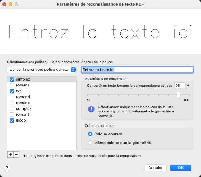 - Utiliser la meilleure correspondance de police. Lorsque cette option est activée, toutes les polices sélectionnées sont comparées et, plutôt que la première correspondance dépassant le pourcentage de conversion défini, c'est celle qui correspond le mieux qui est utilisée.