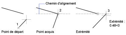 Dans l'illustration suivante, le mode d'accrochage aux extrémités est activé. Pour commencer une ligne, cliquez sur son point de départ (1), amenez le curseur à l'extrémité d'une autre ligne (2) pour acquérir ses coordonnées, puis placez le curseur sur le chemin d'alignement horizontal afin de positionner l'extrémité qui vous intéresse pour la ligne à tracer (3).