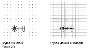 Vous pouvez modifier le style d'affichage de la grille à l'aide des options disponibles dans l'onglet Accrochage/Grille de la boîte de dialogue Paramètres de dessin. Par exemple, la grille s'affiche sous la forme d'un ensemble rectangulaire de lignes par défaut, mais vous pouvez choisir le style de grille en pointillés hérité lorsque le style visuel Filaire 2D est utilisé.