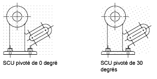 Si vous devez dessiner le long d'un angle ou d'un alignement spécifique, vous pouvez changer la grille et l'angle d'accrochage en pivotant le système de coordonnées utilisateur (SCU). Cette rotation s'applique aussi au réticule. Dans l'exemple suivant, le SCU est pivoté à 30 degrés afin de correspondre à l'angle du support d'ancrage.