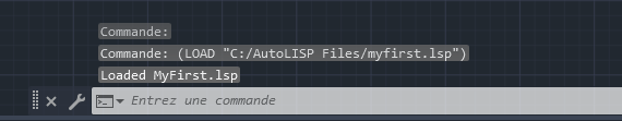 Une fois chargé, le message « Loaded myfirst.lsp » (myfirst.lsp chargé) doit s’afficher dans l’historique de la fenêtre de la ligne de commande qui a été affiché par la fonction d’invite.