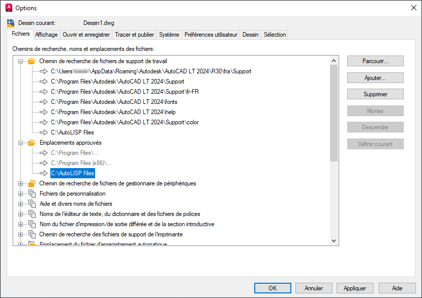 Les dossiers répertoriés sont ceux dans lesquels AutoCAD LT recherche vos fichiers AutoLISP parmi d’autres types de fichiers personnalisés utilisés pour stocker des motifs de hachures, des types de ligne, des alias de commande et définir de nouveaux éléments d’interface utilisateur.