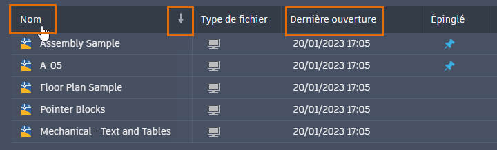- Vue sous forme de liste : cliquez sur l'en-tête de colonne Nom ou Dernière ouverture pour trier les documents. Cliquez sur la flèche verticale située à droite de la méthode de tri pour inverser l'ordre de tri.