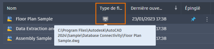 - Dans l'une ou l'autre vue, placez le curseur sur l'icône Type de fichier pour afficher le chemin source du fichier.