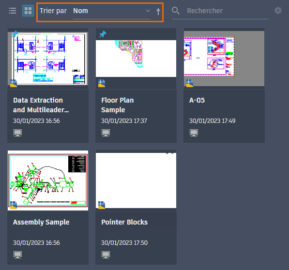 - Vue sous forme de grille : cliquez sur la méthode de tri souhaitée. Cliquez sur la flèche verticale située à droite de la méthode de tri pour inverser l'ordre de tri.