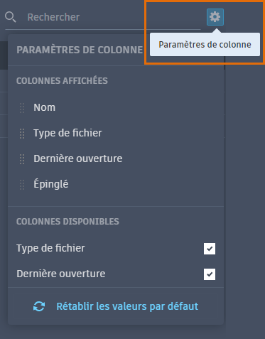 Dans la vue sous forme de liste, l'icône des paramètres de colonnes (engrenage) située dans le coin supérieur droit permet de personnaliser la vue en activant ou désactivant les colonnes affichées et leur ordre d'affichage. Les colonnes Nom et Épinglé sont toujours affichées en tant que première et dernière colonnes, respectivement.