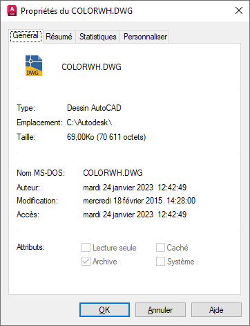 Affiche des informations en lecture seule fournies par le système d'exploitation concernant le fichier de dessin.