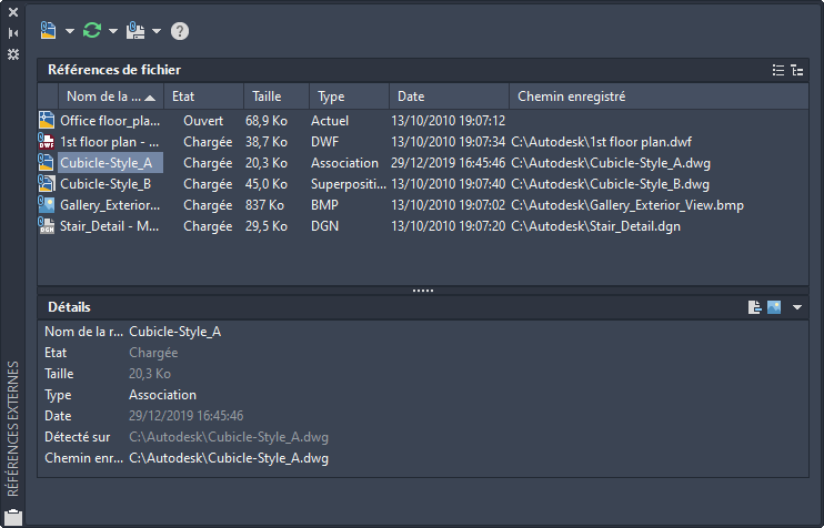 Affiche une liste des références dans le dessin actuel, y compris les informations telles que l'état, la taille et la date de création.