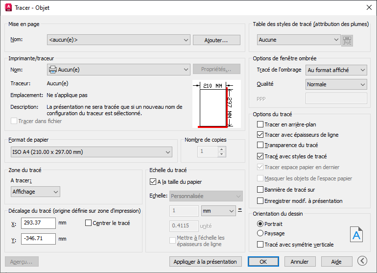 Indique la partie du dessin à tracer. Sous Que tracer, vous pouvez sélectionner une zone du dessin à tracer.
