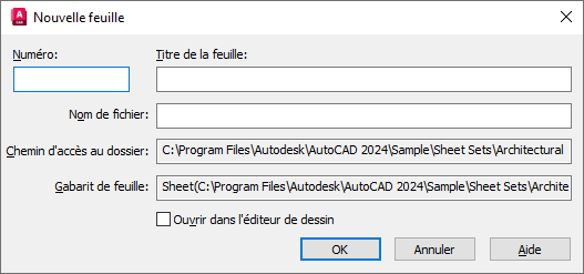 Indique le nom du nouveau fichier dessin contenant la feuille. Par défaut, le nom du fichier dessin est le numéro de la feuille combiné au titre de la feuille. Vous pouvez également modifier le nom du fichier dessin dans cette zone.