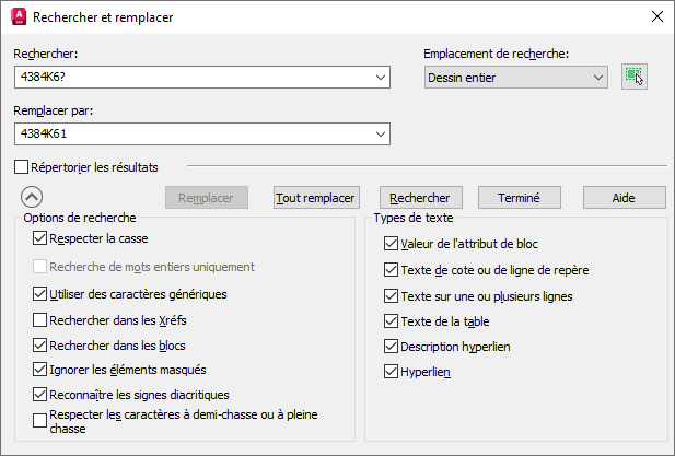 Par exemple, si vous disposez de plusieurs pièces similaires dans votre dessin et que vous devez toutes les modifier sur 4384K61, entrez 4384K6? dans le champ Rechercher et 4384K61 dans la zone Remplacer par.