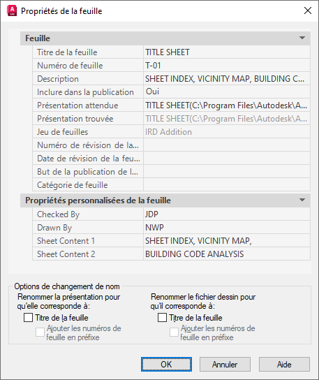 Affiche les propriétés de la feuille sélectionnée. Affiche également les propriétés personnalisées, le cas échéant. Vous pouvez entrer une nouvelle valeur pour modifier la propriété de feuille de votre choix. La Présentation attendue est le chemin et le nom de fichier du dessin dans lequel a été enregistrée la feuille. La Présentation trouvée est le chemin et le nom de fichier du dessin dans lequel a été trouvée la feuille. S'ils sont différents, vous pouvez modifier le chemin et le nom de fichier dans Présentation attendue. Cette opération permet d'associer de nouveau la feuille avec le jeu de feuilles correspondant.