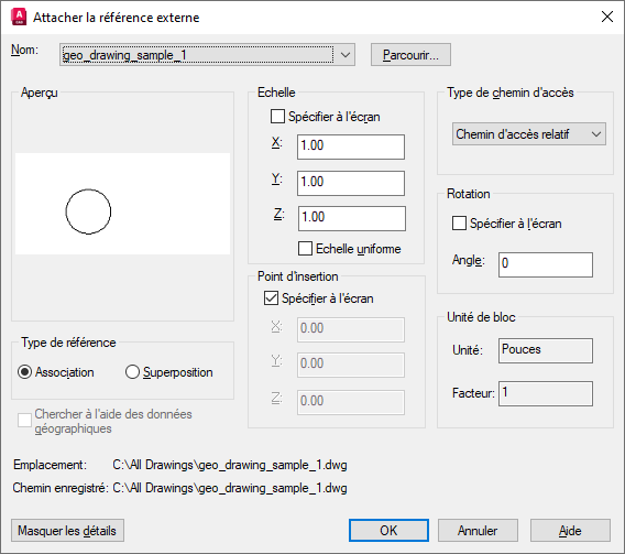 Sélectionnez le chemin d'accès complet (absolu), le chemin d'accès relatif au fichier de référence externe, ou aucun chemin d'accès, le nom de la référence externe (le fichier doit figurer dans le dossier contenant le fichier de dessin actuel).