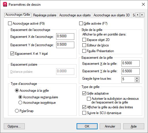 Onglet Résolution/Grille (boîte de dialogue Paramètres de dessin)