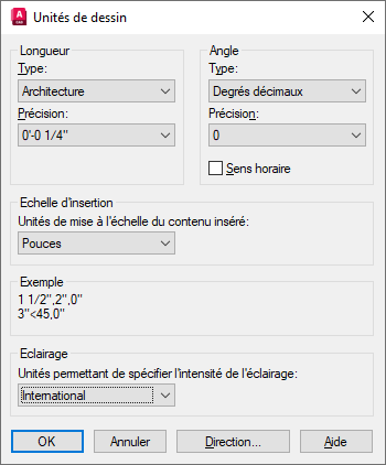 Les valeurs possibles sont Architecture, Décimal, Ingénierie, Fractionnaire et Scientifique. Les formats Ingénierie et Architecture génèrent des affichages en pieds et en pouces et supposent que chaque unité de dessin représente un pouce. Les autres formats peuvent représenter une unité réelle quelconque.