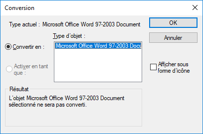 Cliquez sur un objet incorporé avec le bouton droit de la souris, puis choisissez OLE Convertir.