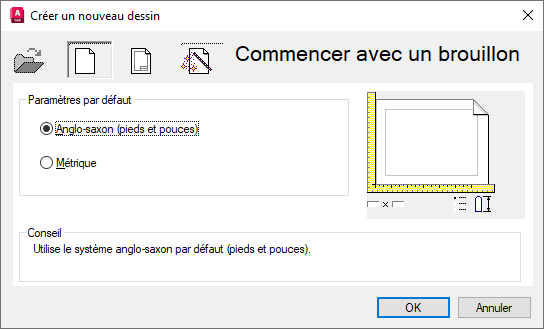 Commencer avec un brouillon crée un nouveau dessin à l'aide des paramètres métriques ou anglo-saxons par défaut. Utiliser un gabarit crée un nouveau dessin en utilisant les paramètres définis dans un gabarit que vous sélectionnez. Utiliser un assistant crée un nouveau dessin en utilisant les paramètres que vous spécifiez dans l'assistant Définition rapide ou Définition avancée. (La première option, Ouvrir un dessin, n'est pas disponible avec la commande NOUVEAU. Pour ouvrir un dessin existant, utilisez la commande OPEN.)