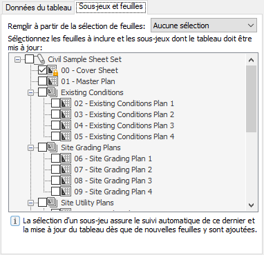 Onglet Sous-jeux et feuilles (boîte de dialogue Tableau des feuilles)