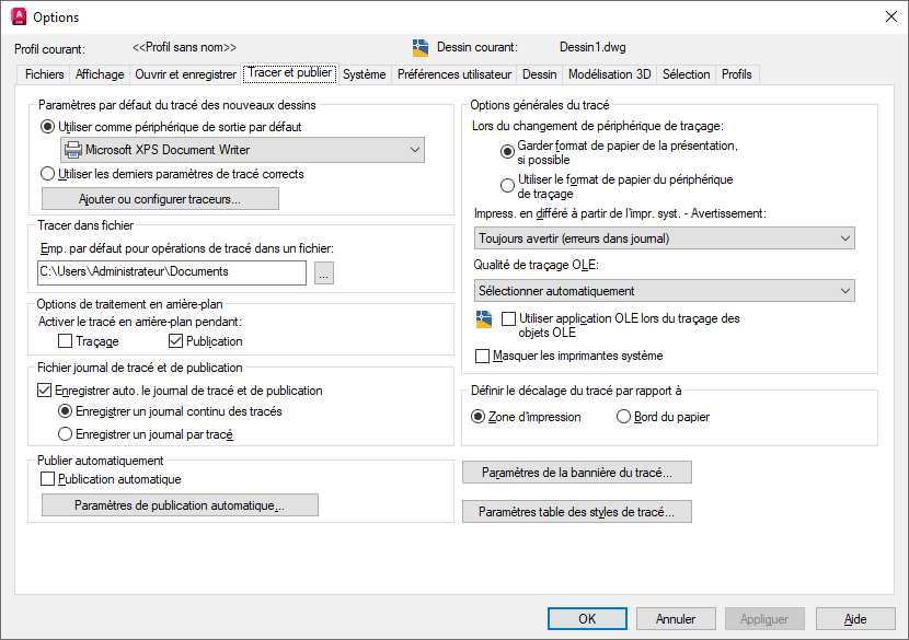 Indique si les dessins sont publiés automatiquement dans des fichiers DWF, DWFx ou PDF. Vous pouvez également contrôler les options de publication automatique.