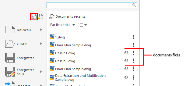 Vous pouvez faire en sorte qu'un fichier reste répertorié, indépendamment des fichiers que vous enregistrez ultérieurement, en cliquant sur le bouton représentant une punaise à droite du nom de fichier. Le fichier est affiché au bas de la liste jusqu'à ce que vous désactiviez ce bouton.