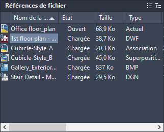 Cette colonne affiche toujours en première entrée le dessin courant, suivi des autres fichiers associés répertoriés dans l'ordre de leur association.