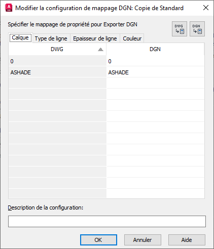 Configuration de mappage existante : si vous êtes en train de modifier une configuration de mappage (même si vous modifiez une configuration autre que Standard à partir de la boîte de dialogue Importer (ou Exporter) les paramètres DGN), les propriétés affichées dans la table de mappage ne sont pas dérivées du fichier DGN importé ou du fichier dessin exporté.