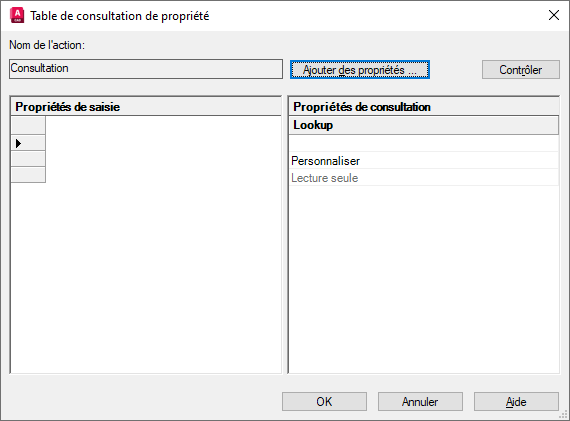 Affiche la valeur personnalisée affectée aux propriétés de saisie. Cliquez sur le bas d'une colonne de consultation pour mettre la propriété de consultation en lecture seule ou autoriser la consultation inversée. L'option Autoriser la consultation inversée active une liste déroulante associée à la poignée de consultation qui modifie la référence de bloc d'après les valeurs de propriétés de saisie dans la table.