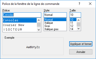 La police du texte utilisée dans la fenêtre de commande peut être modifiée en fonction de vos préférences.