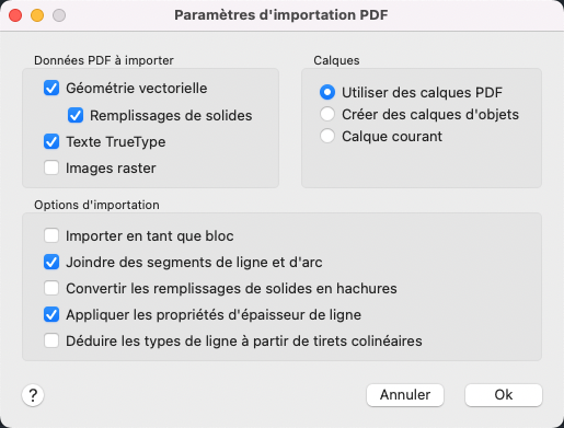 Détermine les options d'importation de la géométrie, des remplissages, des images raster et des objets texte TrueType à partir d'un calque sous-jacent ou d'un fichier PDF spécifié.