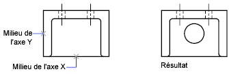Dans l'exemple suivant, le trou du plateau de montage a été centré sur le rectangle en déterminant les coordonnées X,Y de son centre à partir des milieux des côtés horizontaux et verticaux du plateau.