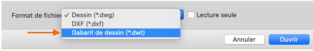 Si vous travaillez de façon indépendante, vous pouvez créer vos fichiers de gabarit de dessin en fonction de vos habitudes de travail. Vous pouvez ajouter les paramètres d'autres fonctions à mesure que vous vous familiarisiez avec elles. Pour modifier un fichier gabarit de dessin existant, cliquez sur Ouvrir, spécifiez le format Drawing Template (*.dwt) dans la boîte de dialogue, puis sélectionnez le fichier gabarit.