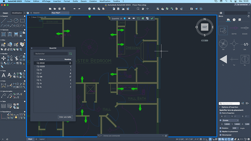 La palette Quantité affiche le nombre d'occurrences de chaque bloc sur le dessin.