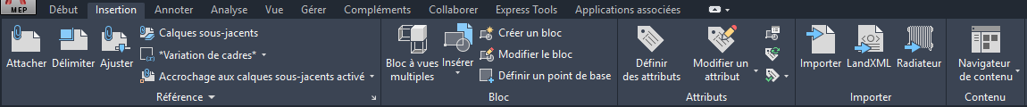 L'onglet Insérer permet de travailler avec des références, des blocs, des blocs à vues multiples, des blocs, des attributs et du contenu provenant de ressources externes telles que le Navigateur de contenu et Autodesk Seek.