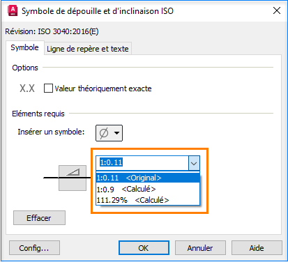 Dans le jeu d’outils AutoCAD Mechanical 2024, les symboles de dépouille et d’inclinaison sont calculés automatiquement de manière dynamique lors de la création ou de la modification du symbole. Le calcul de la dépouille et de l’inclinaison est toujours conservé lorsque vous sélectionnez une ligne de base pour le calcul. Vous pouvez choisir de ne pas créer de symboles de calcul ou de modifier manuellement la valeur calculée lorsque vous créez ou modifiez le symbole. Le texte <Original> s’affiche en regard du taux de dépouille et d’inclinaison.