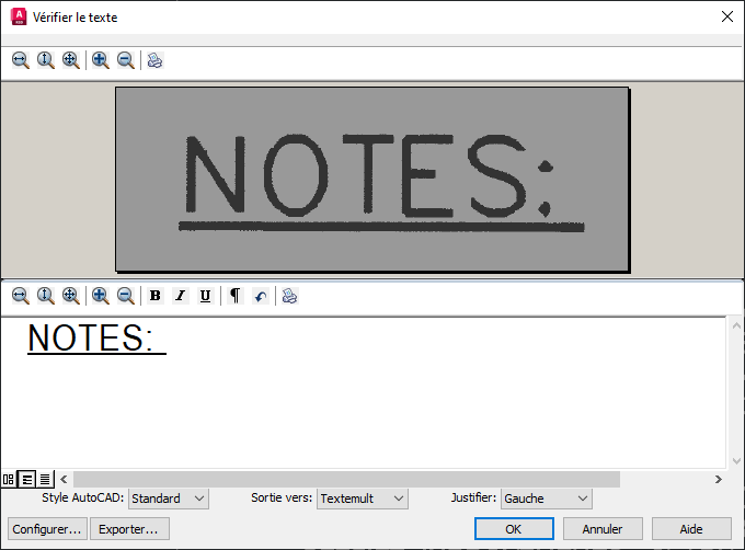 La fenêtre Vérifier le texte affiche NOTES: dans les volets de visualisation (en haut) et d'édition (en bas). Si le texte NOTES: n'est pas souligné dans le volet d'édition, cliquez et faites glisser le curseur pour sélectionner le mot, puis cliquez sur l'option de soulignement du texte dans la barre d'outils d'édition. Si le moteur de reconnaissance a inséré des caractères non souhaités, supprimez-les du volet d'édition.