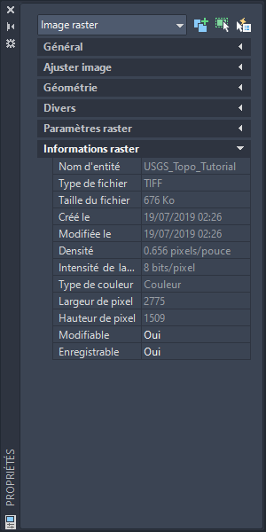 Cet exemple montre l'aspect de la palette Propriétés lorsqu'une image raster est sélectionnée. Les données de l'image apparaissent dans la section Informations Raster, à la fin de la liste des propriétés.