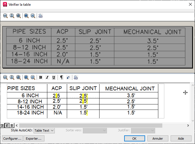- Cliquez sur OK pour insérer la table en tant que texte AutoCAD dans le dessin, puis appuyez sur la touche ECHAP pour arrêter la commande.
