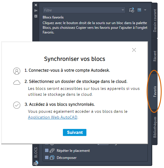 Dans cette mise à jour, lorsque vous utilisez votre compte Autodesk et synchronisez vos blocs avec un fournisseur de stockage dans le cloud, vos blocs récents et favoris deviennent accessibles sur tous les appareils.